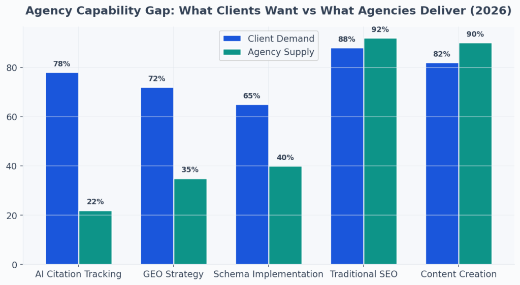 The widest capability gap is in AI citation tracking: 78% of clients want it but only 22% of agencies can deliver (AiBoost market analysis, 2026).