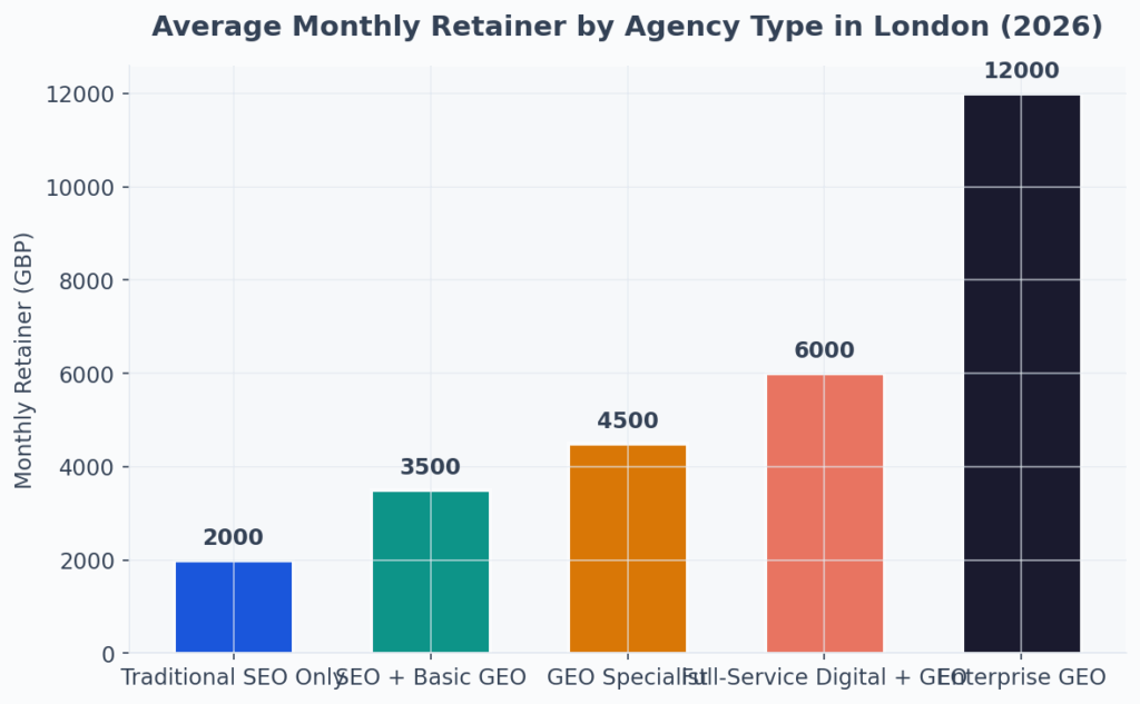 GEO specialist agencies in London charge an average of £4,500 per month, positioned between basic SEO and full-service digital packages (AiBoost market analysis, 2026).