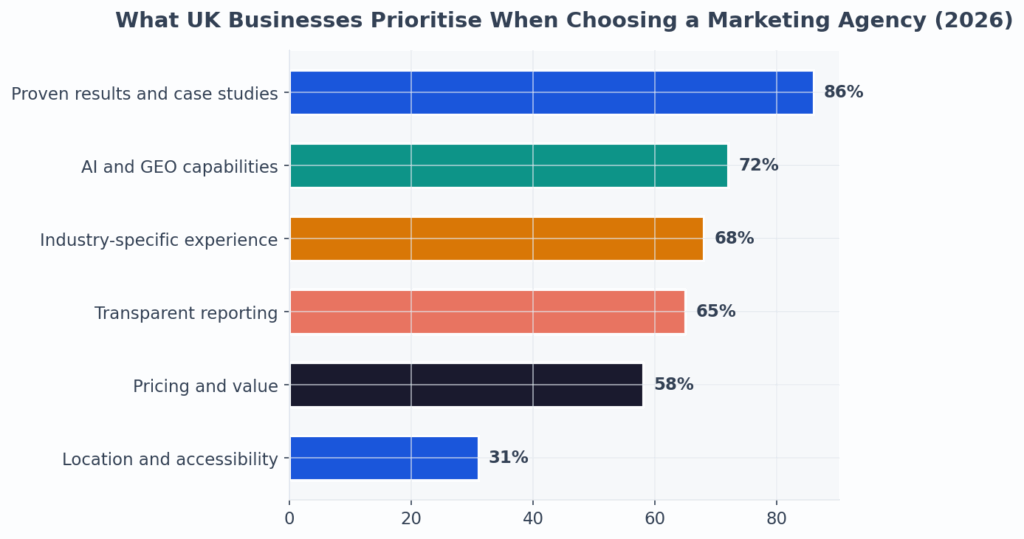 Proven results remain the top selection criterion, but AI and GEO capabilities have risen to second place for UK businesses choosing agencies in 2026 (AiBoost survey, 2026).