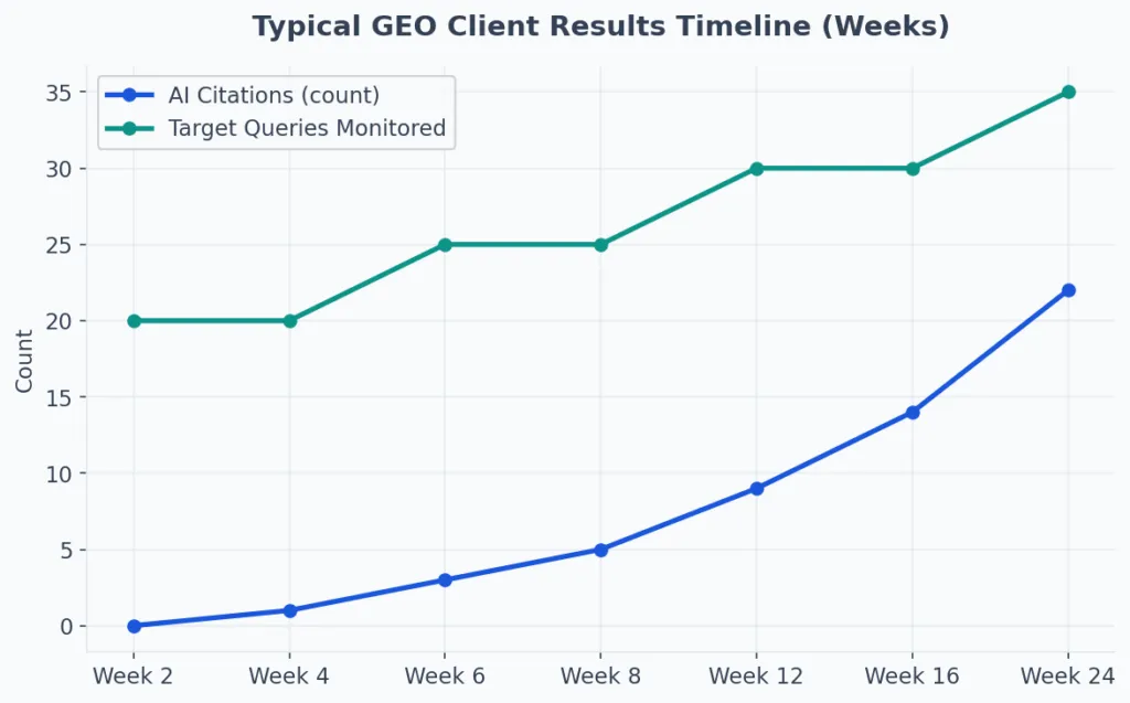 Most clients see first AI citations within 4 weeks of content restructuring. Significant, compounding visibility typically develops after 3 to 6 months. The timeline depends on existing content quality, domain authority, and the competitiveness of target queries.