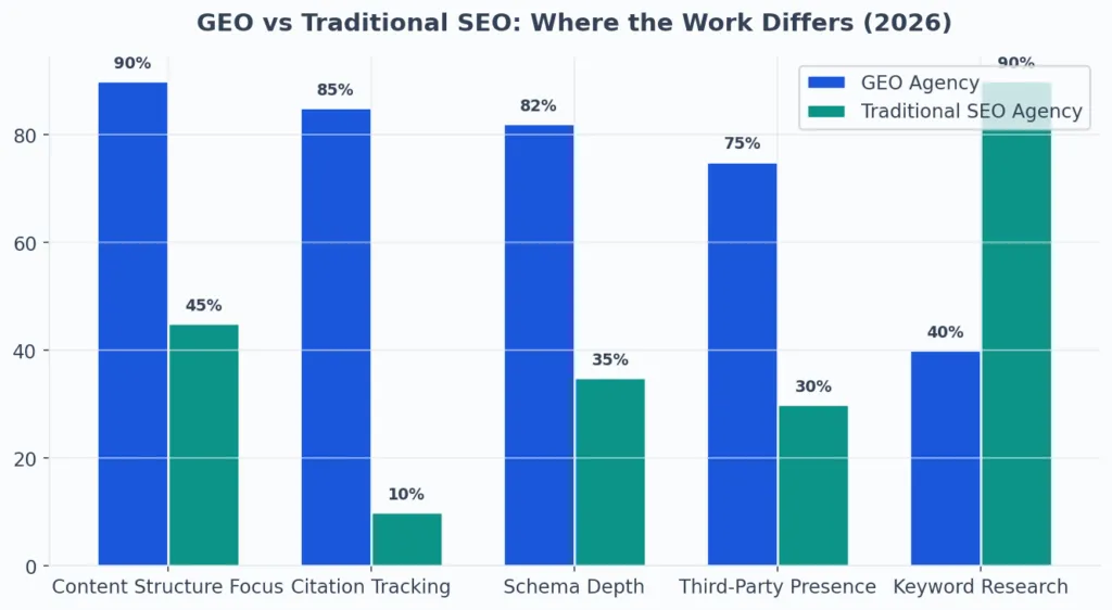 Traditional SEO optimises for rankings on search engine results pages. GEO optimises for citations inside AI-generated answers. The work differs in focus: GEO prioritises content structure and passage-level extractability over keyword density and backlink volume. Only 15% of pages retrieved by ChatGPT earn a citation, making content quality and structure disproportionately important.